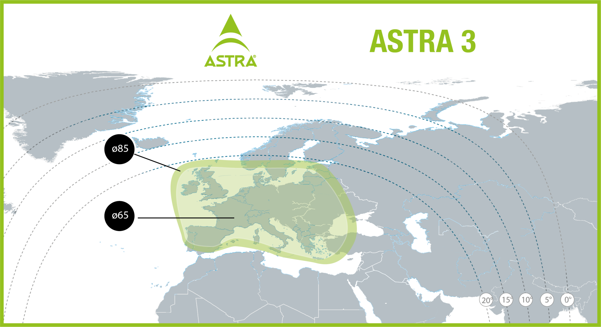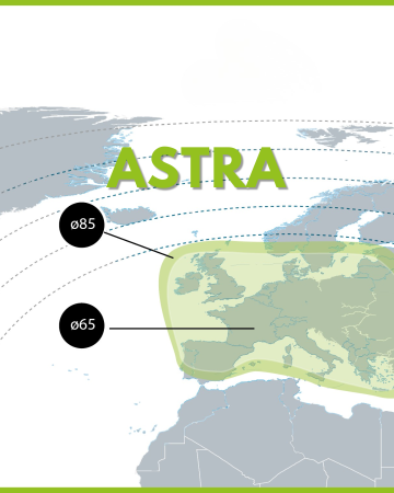 De footprint geeft aan waar het signaal van de satelliet goed te ontvangen is. Astra 3 zendt uit over een groot deel van Europa. Binnen dit gebied heb je meestal een goed en stabiel signaal. In Nederland en België heb je in principe genoeg aan een schotel van 65 cm. Ga je verder naar het zuiden of noorden van Europa, dan kan het nodig zijn om een grotere schotel te gebruiken voor goede ontvangst. Zie afbeelding.